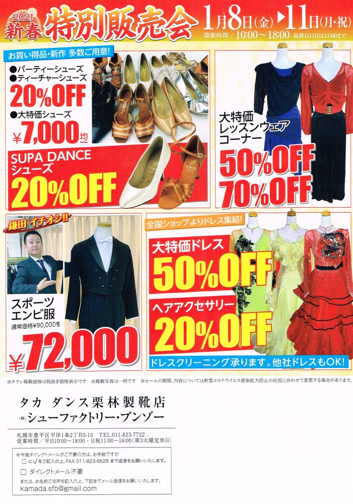 タカダンスさんから新春特別販売会のご案内が届いています。