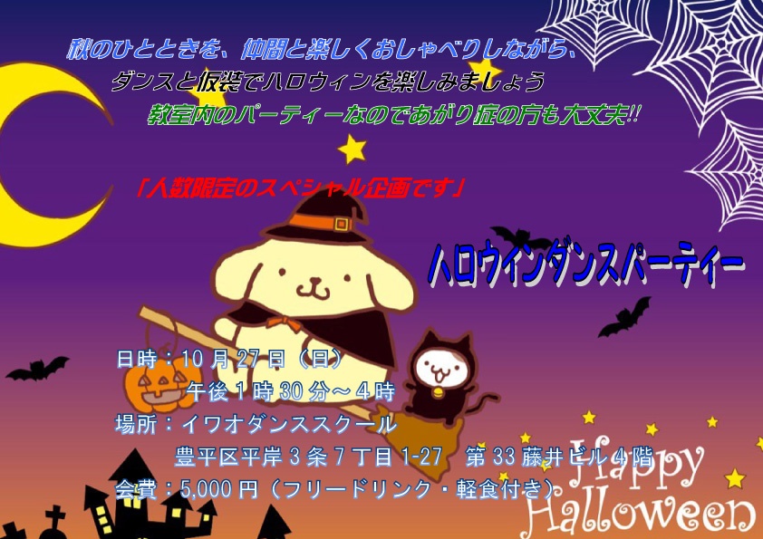 さて今度の27日日曜日に当教室で「Halloween Dance Party」を行います。時間は午後1時30分から4時までです。会費5,000円です。ダンサーも入って沢山踊りながら、おしゃべりや仮装で楽しいひと時を。